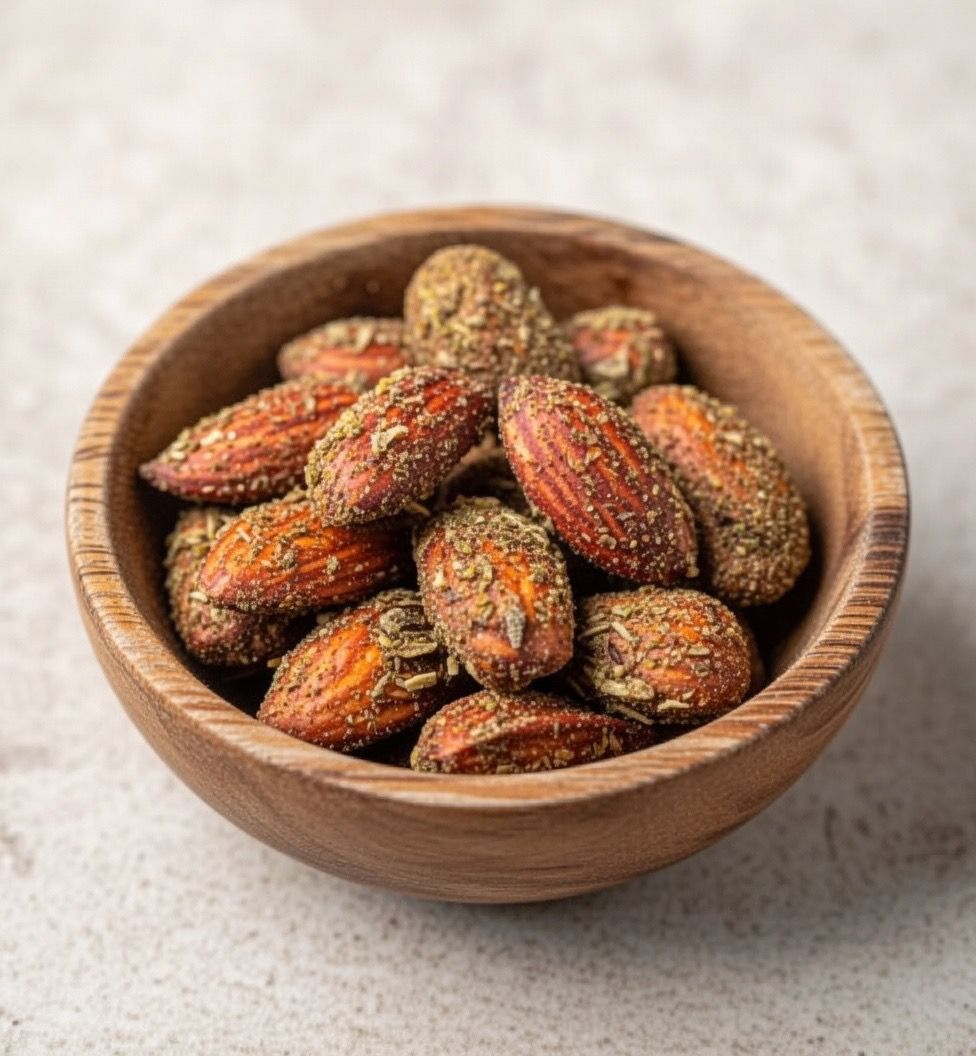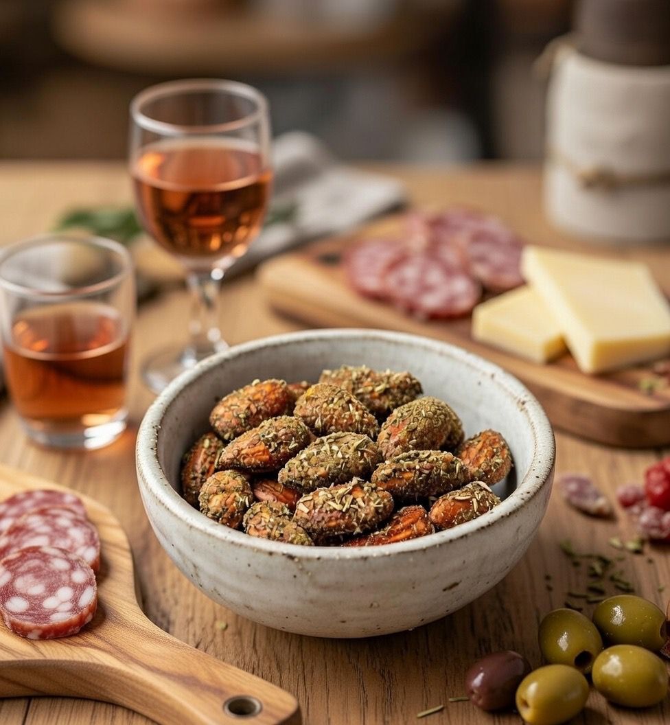 Imaginez un apéritif qui s’étire, une poignée d’amandes miel romarin déposée au centre de la table. Le parfum du romarin s’élève, la douceur du miel équilibre le croquant de l’amande. Chaque bouchée appelle la suivante.