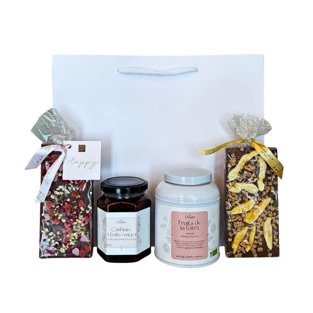 Un coffret tendre et gourmand pour dire “je t’aime” à Mamie : deux tablettes de chocolat, une infusion  aux fruits de la forêt et une confiture 4 fruits rouges. Une attention douce et réconfortante, pensée pour lui faire plaisir.