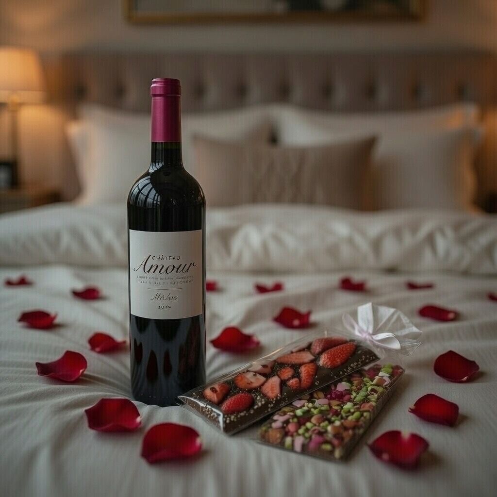 Une attention gourmande et romantique composée de deux tablettes artisanales spéciales Saint-Valentin (chocolat noir fraise & chocolat au lait pistache cœurs) accompagnées d’une bouteille de Château Amour Médoc. Un trio intense et élégant pour célébrer l’amour.