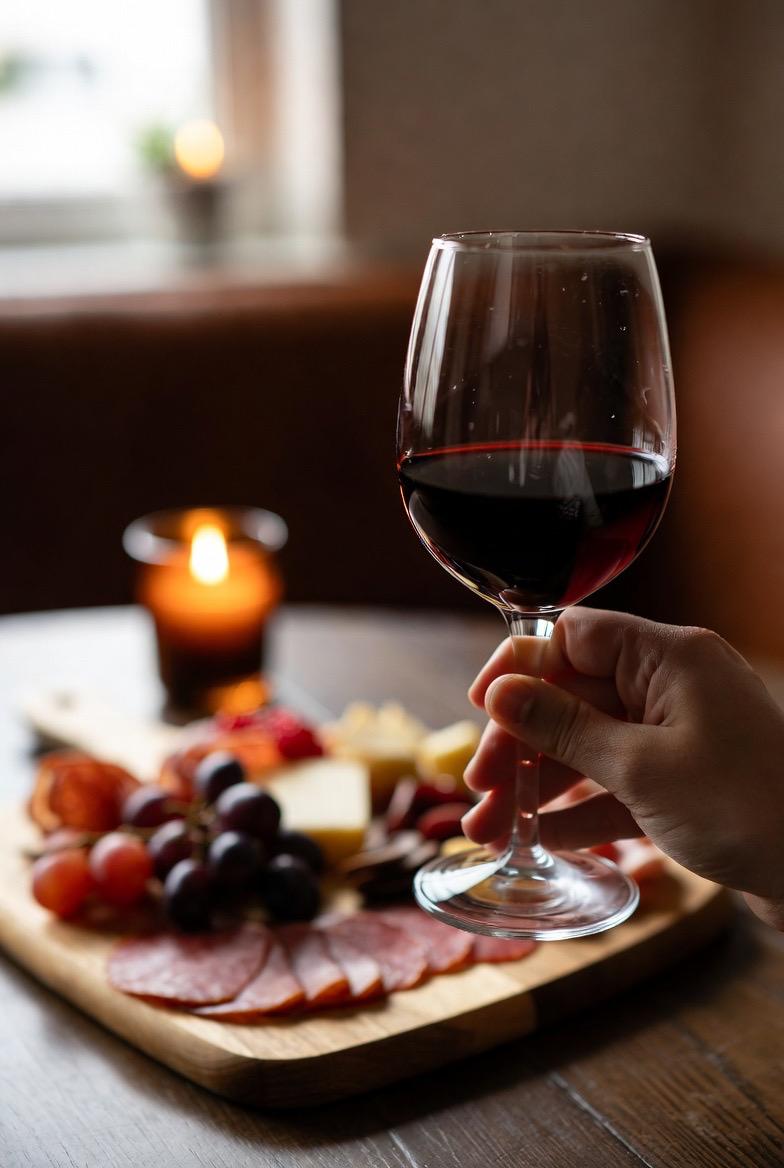 Plaisir gourmand : Un plateau de charcuterie accompagné d’une bouteille de vin rouge