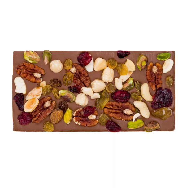 Tablette de chocolat au lait artisanale, généreusement garnie d’un mélange raffiné de fruits à coque et de canneberges. Une création gourmande et croquante, alliant douceur, texture et intensité.
