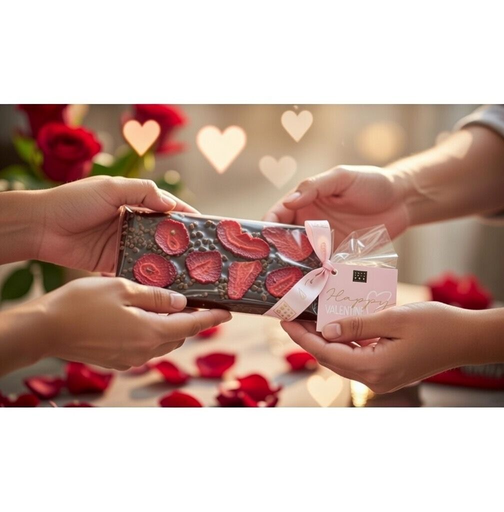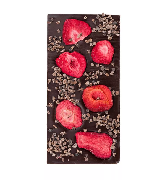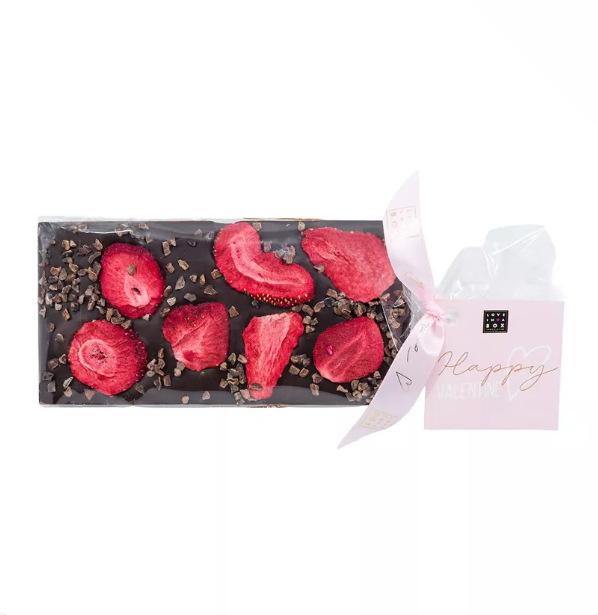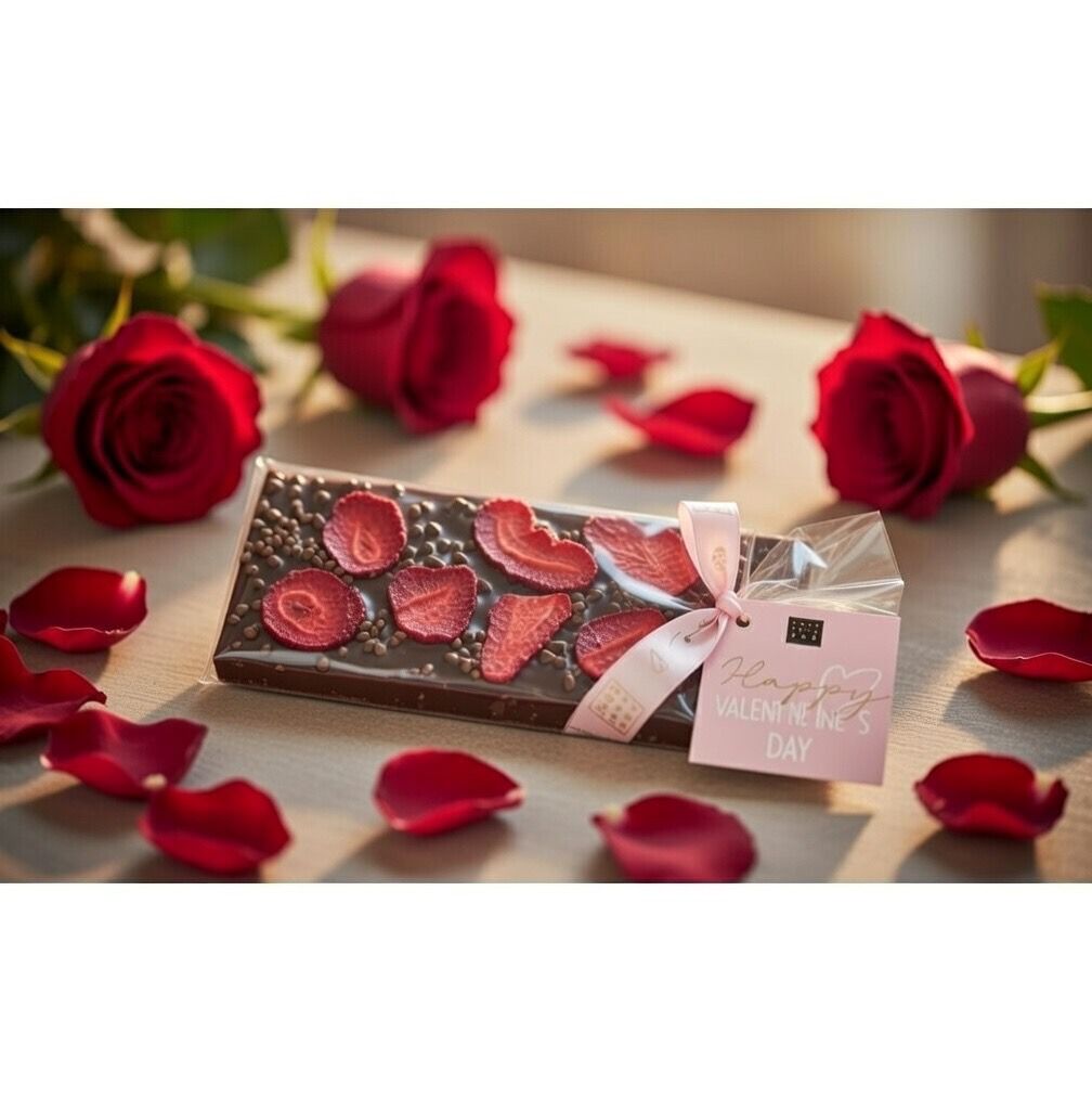 Tablette de chocolat noir artisanale, décorée de fraises lyophilisées et d’éclats de cacao. Une création intense et passionnée, pensée pour célébrer l’amour avec gourmandise.